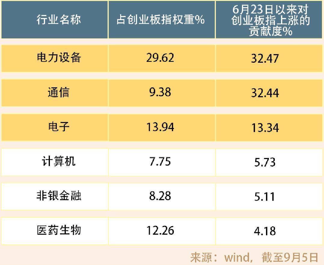 Wind数据显示,截至9月5日,6月23日以来,创业板指中电力设备、通信两个行业对涨幅贡献度最高,均达到32%。电力设备受益于反内卷政策、固态电池利好等,通信成分股包含“易中天”等明星个股,电子上涨贡献度也达到13%。上述三大行业对创业板指本轮涨幅贡献度达78%。