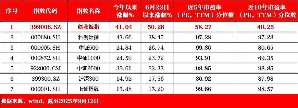 三季度以来九连阳,创业板指凭借凌厉的涨势成为市场焦点。Wind数据显示,截至9月12日收盘,创业板指年内涨幅达41%,其中6月23日行情启动以来累计上涨50%,较同期沪深300指数的涨幅高出近33个百分点。值得关注的是,强势领跑后,创业板指估值仍具优势。其市盈率(TTM)近10年分位数为40%,显著低于上证指数、沪深300、中证500、科创综指等宽基指数。