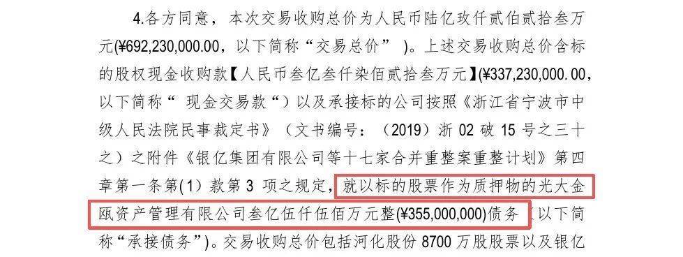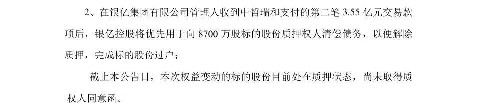 r 在9月10日的公告中,河化股份明确表示,标的股份目前仍处于质押状态,尚未取得质权人同意函。公告同时指出,银亿控股计划在收到中哲瑞和支付的第二笔3.55亿元交易款后,优先用于向质权人清偿债务,以解除质押、完成股份过户。