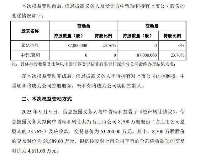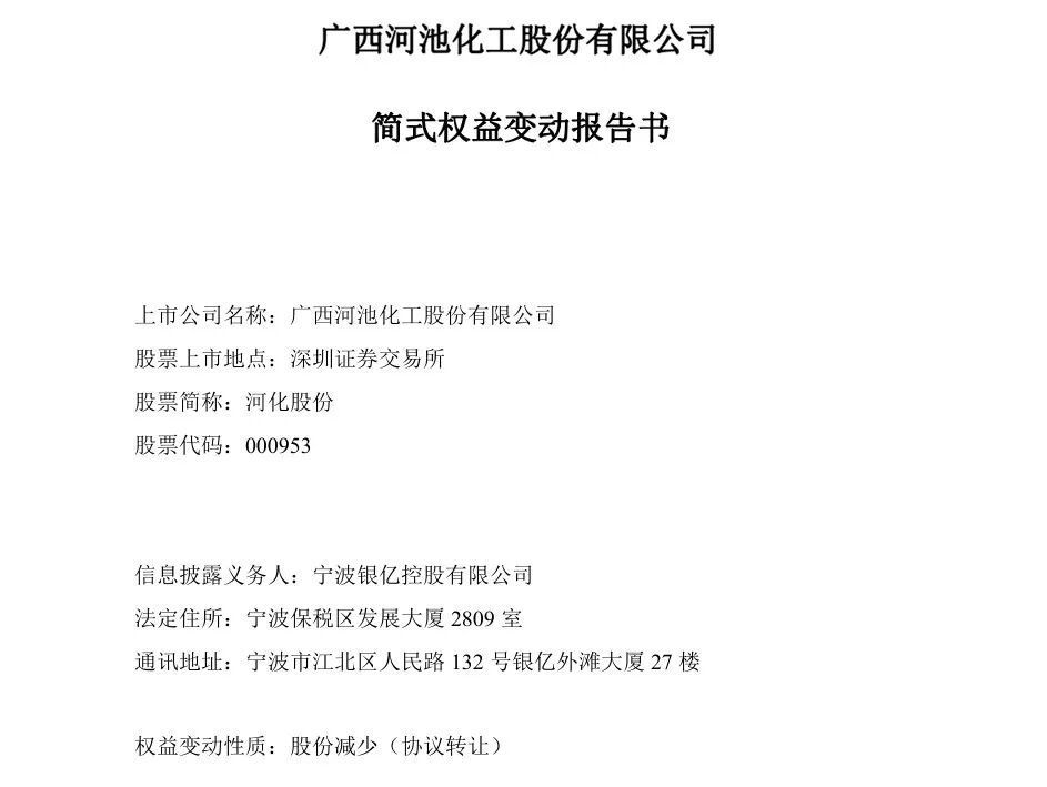 r 9月13日,在推出第二次控股权变更方案后第三天,河化股份披露《简式权益变动报告书》,宣布控股股东宁波银亿控股有限公司(简称“银亿控股”)将所持8700万股股份(占总股本23.76%)转让给宁波中哲瑞和企业管理咨询有限公司(简称“中哲瑞和”)。在本次权益变动完成后,中哲瑞和将成为公司控股股东,杨和荣将成为公司实际控制人。