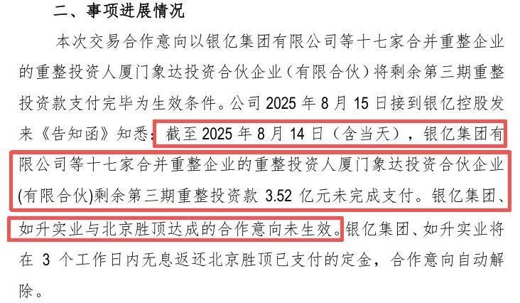 r 该计划不久便告吹。8月15日晚,河化股份公告称,因银亿集团等十七家合并重整企业的重整投资人——厦门象达投资合伙企业(有限合伙),未在8月14日前足额支付剩余3.52亿元第三期重整投资款,交易生效条件未达成,双方合作意向正式解除。(详见《000953,“铁公鸡”果然“难吃”》)