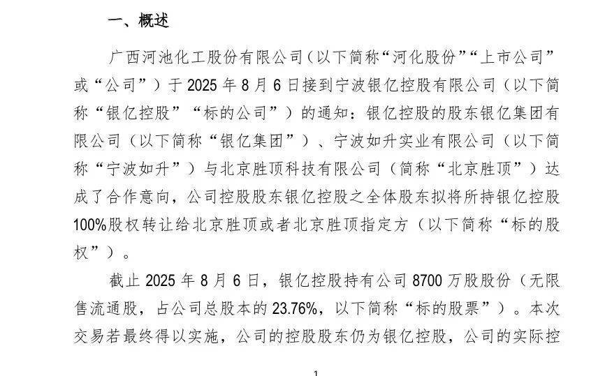 8月6日晚间,公司披露控股权变更计划,根据公告,银亿控股全体股东拟将所持银亿控股100%股权,转让给北京胜顶科技有限公司(简称“北京胜顶”)或其指定方,交易总价6.92亿元。待交易完成后,北京胜顶将间接持有河化股份23.76%股权(对应8700万股),公司实控人也将变为北京胜顶股东张建伟、苌向阳。