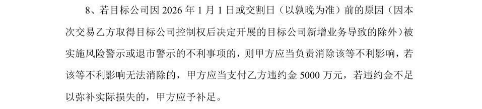r 此外,在资产转让协议中设置了严格的“追责条款”:若河化股份因2026年1月1日或交割日前的自身原因,被实施风险警示或退市警示,且银亿控股无法消除该不利影响,需向中哲瑞和支付5000万元违约金,违约金不足以弥补损失的部分还需补足。若公司因此被实施退市风险警示或终止上市,中哲瑞和有权单方面解除协议。这一条款不仅让银亿控股面临高额赔偿风险,也为此次股权转让增添了“随时终止”的变数。