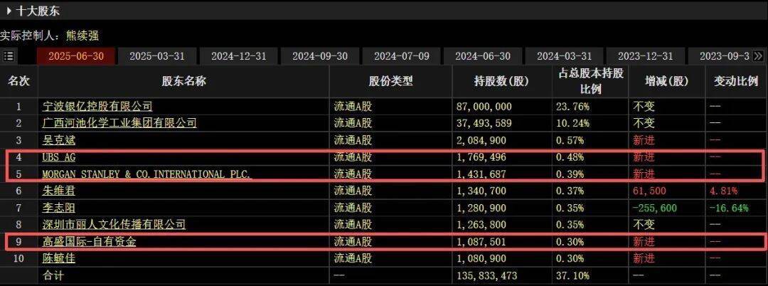 据公司2025年半年报显示,截至6月30日,河化股份前十大流通股东中,新进3家外资机构与2名自然人。瑞银、摩根士丹利、高盛国际分别持股176.95万股、143.17万股、108.75万股;自然人吴克斌、陈毓佳则分别持有208.49万股、108.09万股。