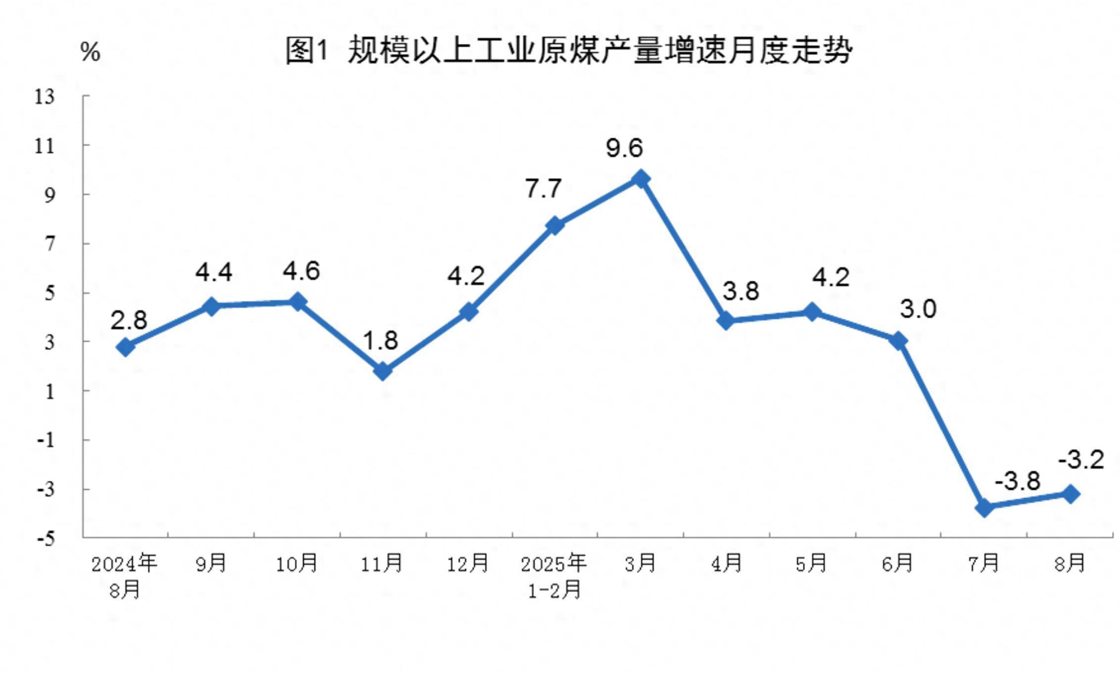 原煤生产降幅收窄。8月份,规上工业原煤产量3.9亿吨,同比下降3.2%,降幅比7月份收窄0.6个百分点;日均产量1260万吨。