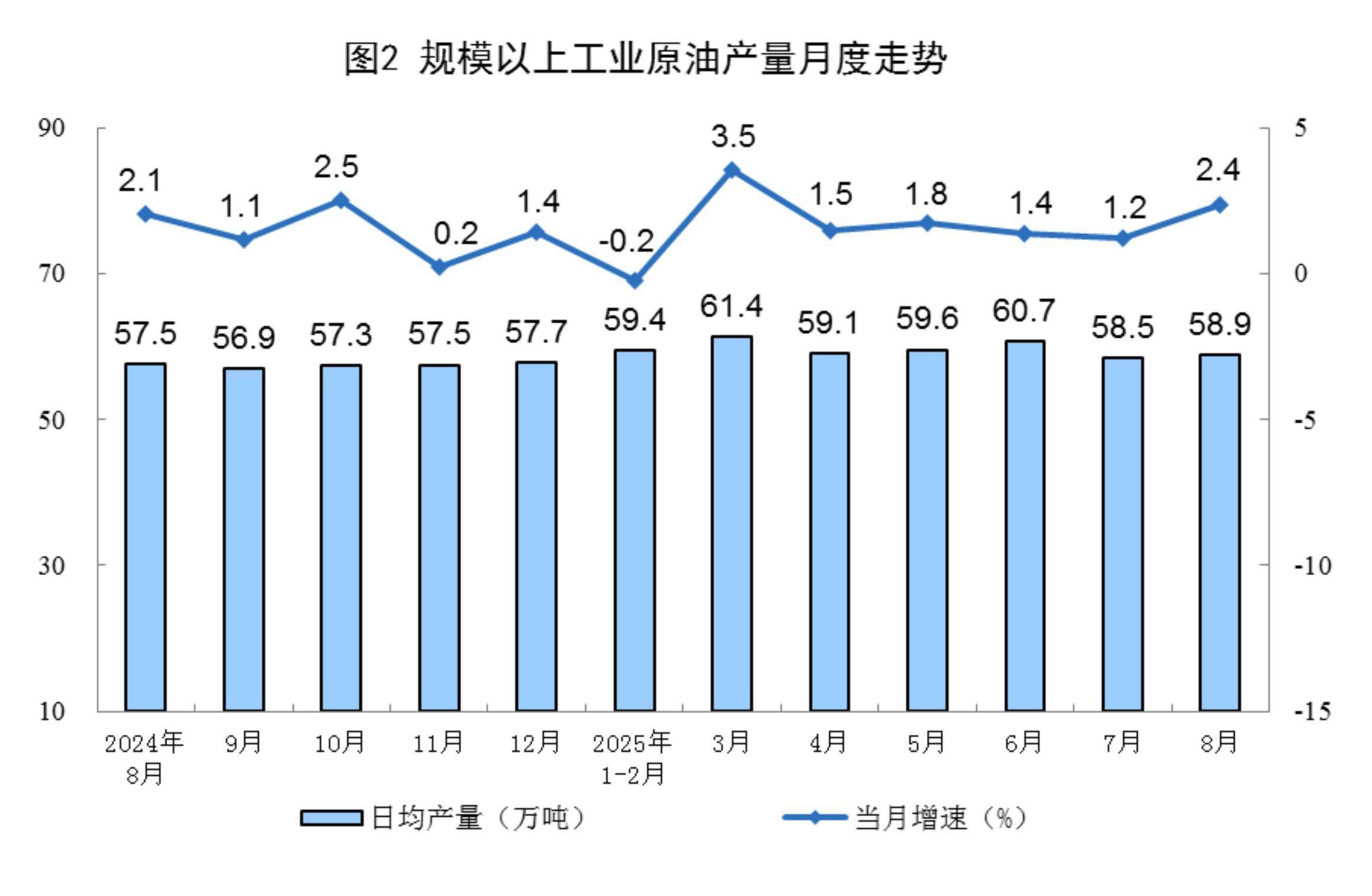 原油生产增速加快。8月份,规上工业原油产量1826万吨,同比增长2.4%,增速比7月份加快1.2个百分点;日均产量58.9万吨。